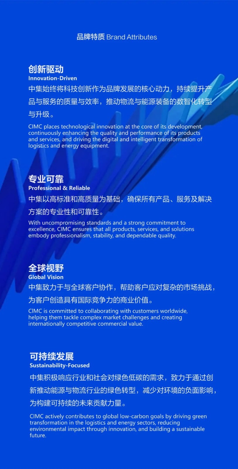 • Brand mission: CIMC is committed to providing high-quality advanced equipment, services and solutions to global customers driven by technological innovation, to promote sustainable development in the logistics and energy industries, and create a better life for humanity.
